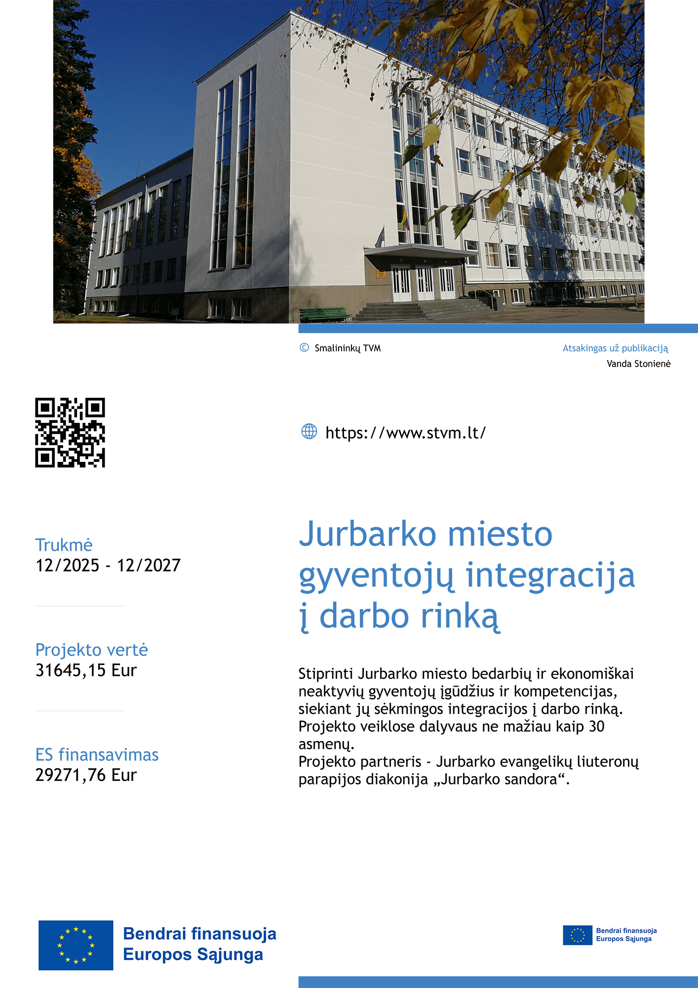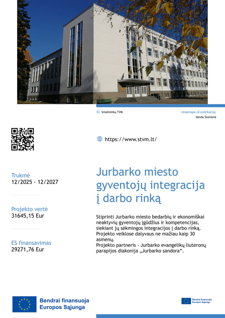 Projekto tikslas – Stiprinti Jurbarko miesto bedarbių ir ekonomiškai neaktyvių gyventojų įgūdžius ir kompetencijas, siekiant jų sėkmingos integracijos į darbo rinką.